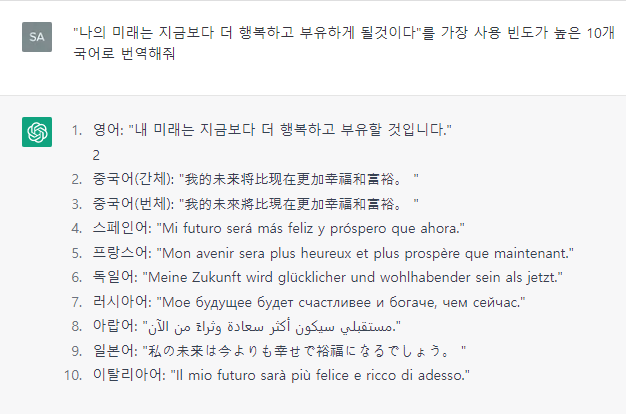 언어 번역: ChatGPT는 한 언어에서 다른 언어로 텍스트를 실시간으로 번역하는 데 사용할 수 있으므로 문화 간 커뮤니케이션을 위한 유용한 도구입니다.