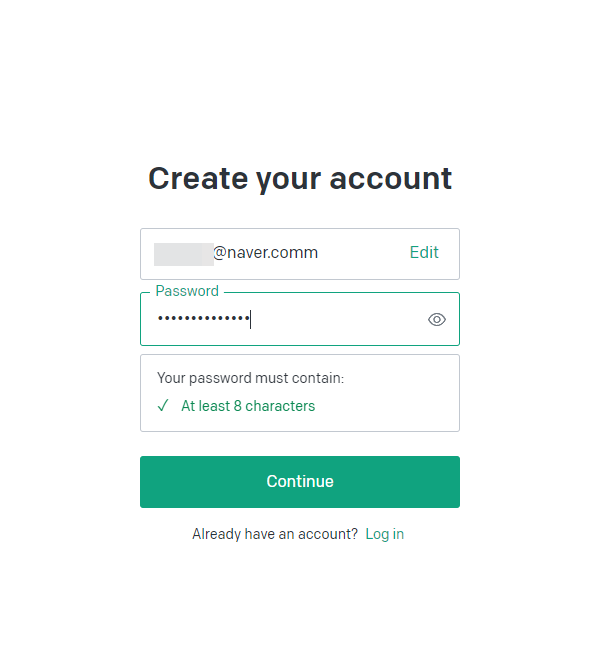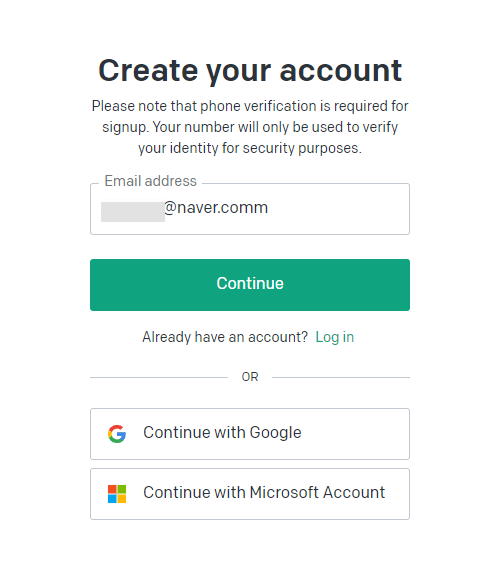 구글 계정이나 MS 계정을 이용하여 회원 가입을 할 수도 있고, 이메일 주소를 직접 입력하여 회원 가입도 가능합니다. 저는 naver 계정으로 가입을 진행해 보았습니다. 이메일 주소를 입력하고, Continue 버튼을 누릅니다. 그 후에는 비밀번호를 입력하고 Continue 버튼을 눌러주세요.